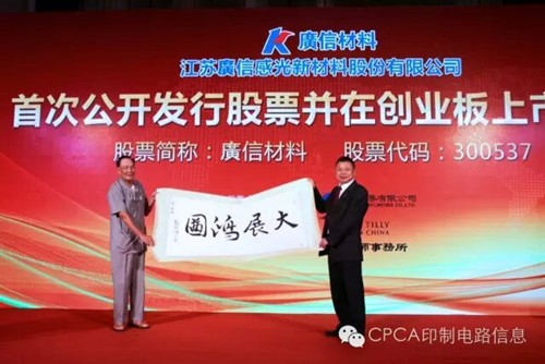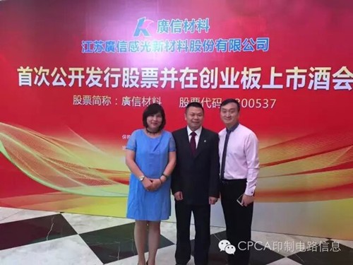 江蘇廣信感光新材料股份有限公司上市了!代表中國印制電路行業協會CPCA由鐳理事長、張瑾秘書長、洪芳和顧瑋珺副秘書長表示熱烈的祝賀!