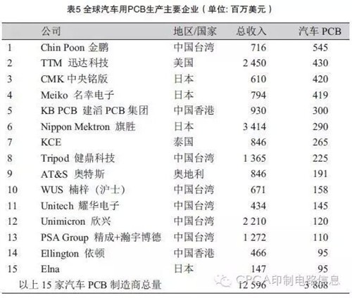 目前日本和中國臺灣的PCB制造商獲得了超過60%的汽車板市場。兩者都是在積極推進,特別是中國臺灣制造商,因為他們的PC主板和HDI微孔板業務正在弱化,從而由汽車板帶動了中國臺灣PCB制造商的地位。主要汽車PCB制造商見表5。