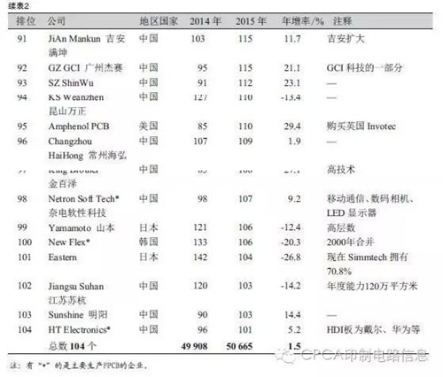 比較NTI-100表并對世界PCB產量作評估(表4)。2015年中國的產量占世界份額的48.5%,其中中國大陸制造商可能為90億美元,或約31%,這在2014年占28%。逐年有更多的中國大陸制造商進入NTI-100排名表。