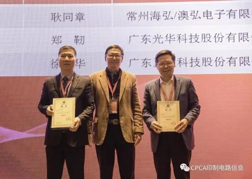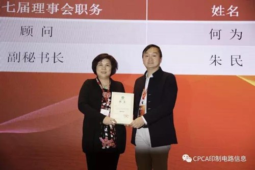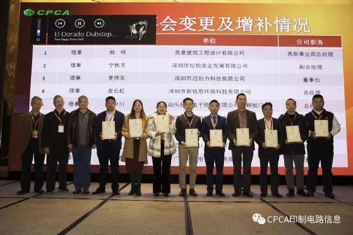 CPCA顧問閆海忠、林金堵、梁志立為新增補的理事:奧意建筑工程設計有限公司高新事業部總經理殷明、深圳市松柏實業發展有限公司副總經理寧秋方、深圳市邁創力科技有限公司董事長麥偉東、深圳市新銳思環保科技有限公司總經理查長虹、廣東汕頭超聲電子股份有限公司覆銅板廠總經理李少川、深圳市宏宇輝科技有限公司總經理朱大勝、深圳市凱碼時代科技有限公司總經理林詠華、迅得機械(東莞)有限公司副總經理謝建平、廣東科翔電子科技有限公司董事長鄭曉蓉頒發證書。
