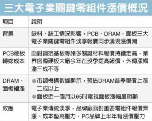 市調機構數據顯示,因缺貨情況延續,預估今年DRAM首季報價上漲二成以上,第2季合約價也有望持續上漲超過一成;至于面板,近一個月以65寸電視面板漲幅最明顯,并列三大漲價零組件之一;如今PCB也吹起漲價潮。