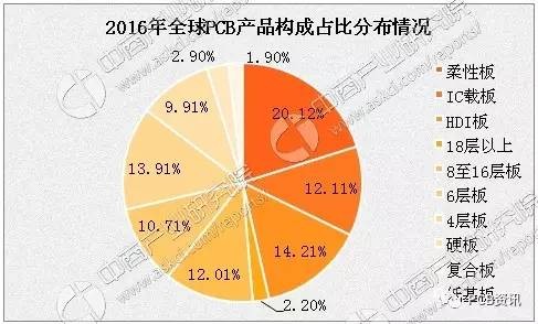 在產品過程方面,2016年,全球4層以上多層板市場容量約為210.6億美元,占整個PCB市場容量的38.9%,其中軟性板位居榜首,占比為20.1%,HDI板以占比14.2%排名第二,IC載板占比12.1%排在第三位。