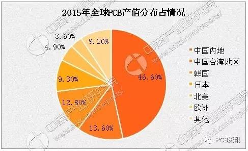 2015年全球PCB產值分布占比分布情況中,中國PCB產值全球總產值占比46.6%,排行第一,成為全球最大的PCB生產基地,而中國臺灣地區和韓國則分別以占比13.6%及12.8%位居第二、第三。隨著PCB產業中心不斷向亞洲地區轉移,中國內地、中國臺灣地區及日本已成為全球PCB主要的生產中心,以亞洲為中心的新產業各級已然形成。