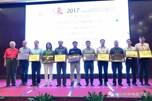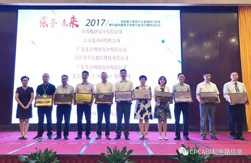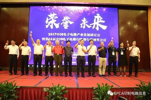 接下來進行第十六屆中國電子電路行業排行榜頒獎儀式,企業代表分批上臺從頒獎嘉賓高素梅執行秘書長、由鐳理事長、黃志東常務副理事長、王龍基名譽秘書長、張瑾秘書長、楊朝輝副理事長、蔡志浩副理事長、董曉軍副理事長、王毅副理事長、黃泰云副理事長、劉德威副理事長、陳興農副秘書長手中接過榮譽獎牌。