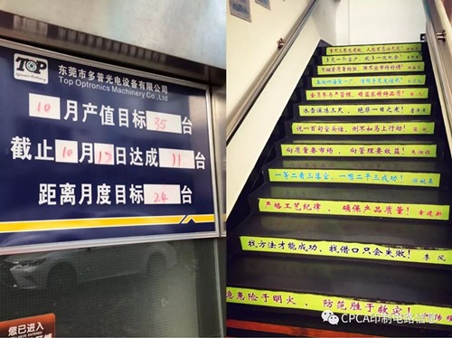 走進(jìn)TOP公司即可醒目的看到門口張貼著本月的生產(chǎn)目標(biāo)以及進(jìn)度。我們一行人隨著陳總到公司二樓進(jìn)行參觀設(shè)備生產(chǎn)現(xiàn)場,上樓的時候我們