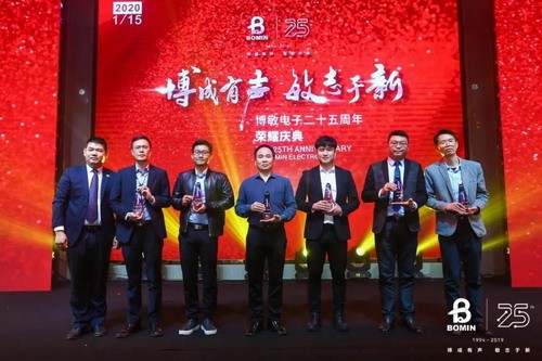晚上六時過半,紀念博敏電子成立二十五周年的榮耀慶典在《博敏之歌》的MV中隆重拉開序幕。 “博覽尖端科技,敏創先鋒品牌,向著目標,孜孜不倦,勝利就在眼前…”激動人心的歌詞瞬間將現場的氣氛推向首個高潮。