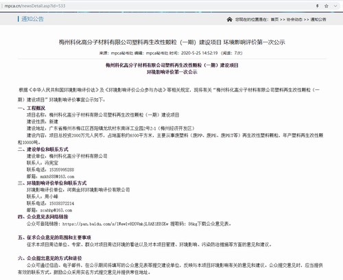 根據《中華人民共和國環境影響評價法》及《環境影響評價公眾參與辦法》等相關規定,現將有關“梅州科化高分子材料有限公司塑料再生改性顆粒(一期)建設項目”環境影響評價事宜公示如下: